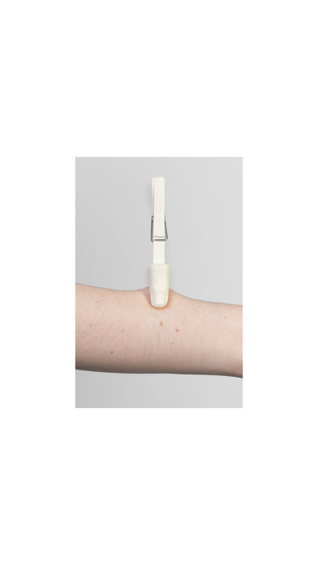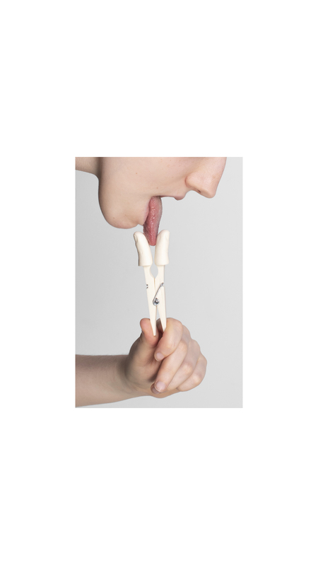В качестве экспозиционного решения фотографии напечатаны на ткани и подвешены на пальцах-прищепках, словно сушатся. Это соединяет изображение и объект в одной точке: фотография удерживается тем же жестом, который внутри серии отвечает за проверку реальности.