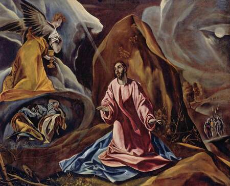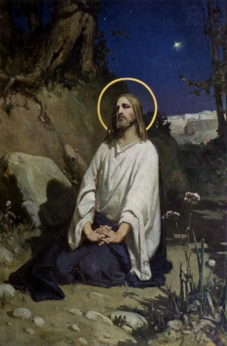 На следующий день Христос будет распят. Его прибьют к кресту и он умрёт, но на третий день — воскреснет. Зная о своей участи, Иисус падёт на землю в саду близ Гефсимании и трижды помолится Богу. Апостолы, которых он пригласит с собой в сад, чтобы читать молитвы и не впасть в искушение, уснут. Иисус молится до кровавого пота, выступившего по телу. Он один в темноте сада, окружённый деревьями и глубиной ночи. Впрочем, он не одинок: во время молитвы к нему является ангел, помогающий укрепить дух и вселяющий уверенность в правильности пути, задуманного Отцом.