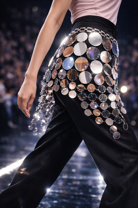 Так оболочка становится динамическим интерфейсом между внутренним состоянием и внешним миром: она не только реагирует на среду, но и визуализирует её характер через свет и отражение, переводя скорость, ритм и намерения в оптический язык. Это превращает одежду в живую систему, где каждый жест оставляет след в зеркальной поверхности, а опасность материализуется в виде сломанных бликов и стремительных световых рефлексов.