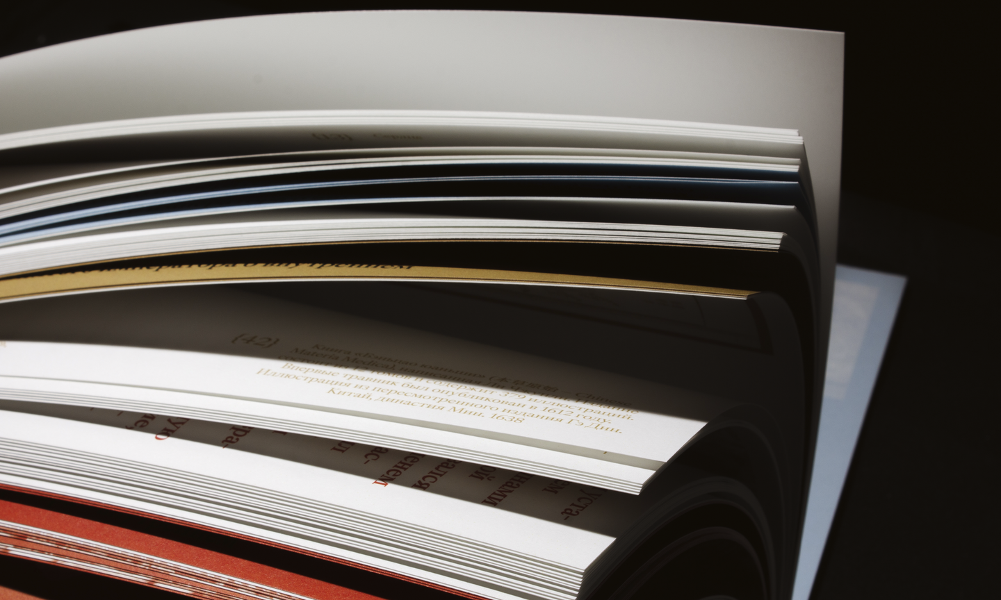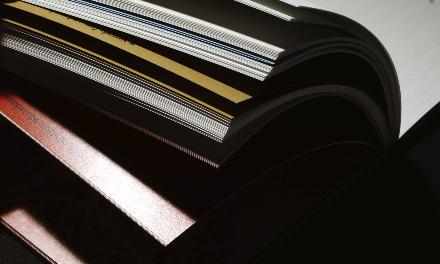 Важным элементом вёрстки являются квадратные скобки, которые, лишаясь нижней части, превращаются в форму, напоминающую китайские ворота. Форма арки прослеживается и на обложке.