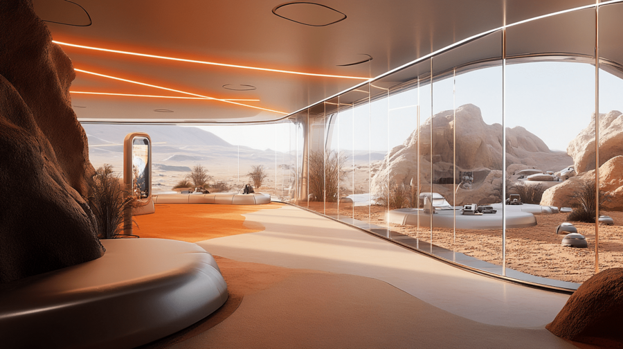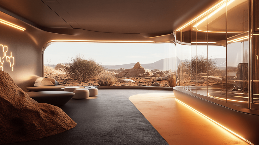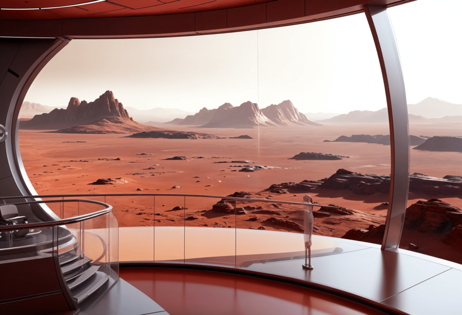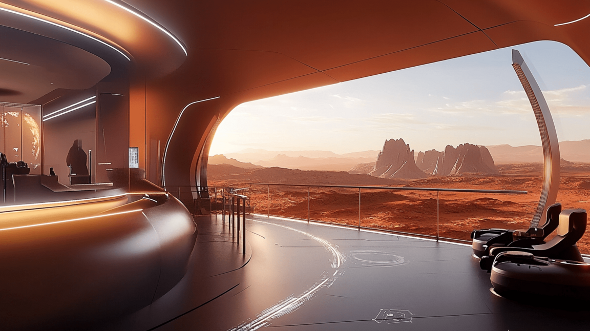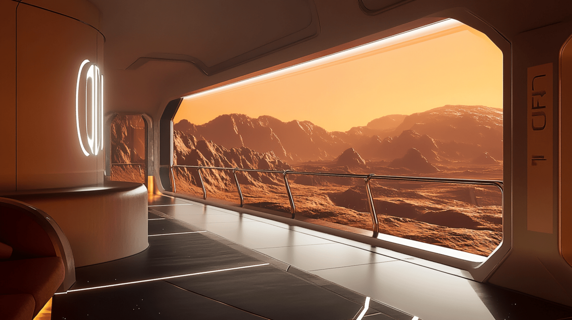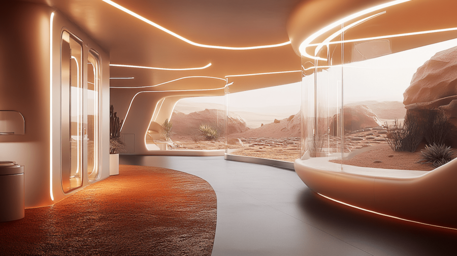Дизайн пространства сочетает марсианскую эстетику с земной функциональностью, создавая атмосферу технологичного уюта. Панорамный вид, тёплое освещение и плавные формы передают ощущение присутствия и адаптации человека к новому миру.