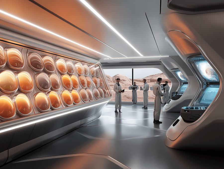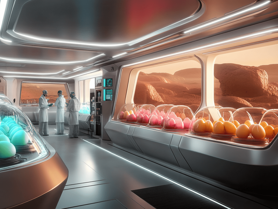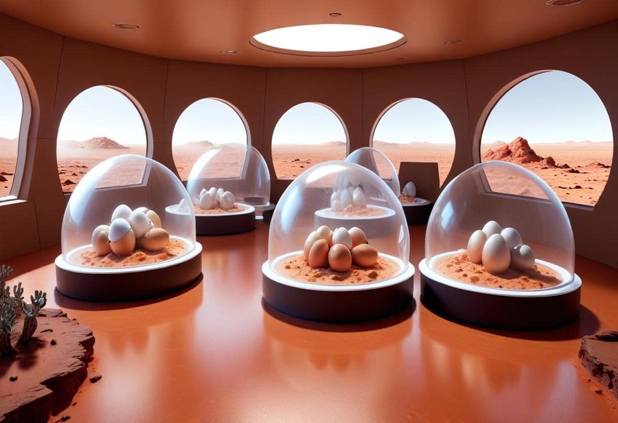 Промпт: High-tech laboratory on a Mars space station, designed for experiments on creating new varieties of Martian eggs. The lab is filled with sleek metallic shelves lined with eggs of various colors, shapes, and sizes, each egg placed in individual transparent containers for controlled observation. Scientists in futuristic lab coats work around the room, analyzing and documenting data on these unique eggs. Digital screens display scientific data, and robotic arms or precise instruments assist in the delicate experiments. The atmosphere is clean, high-tech, and organized, with soft, ambient lighting highlighting the colorful array of eggs and creating an advanced, scientific environment.