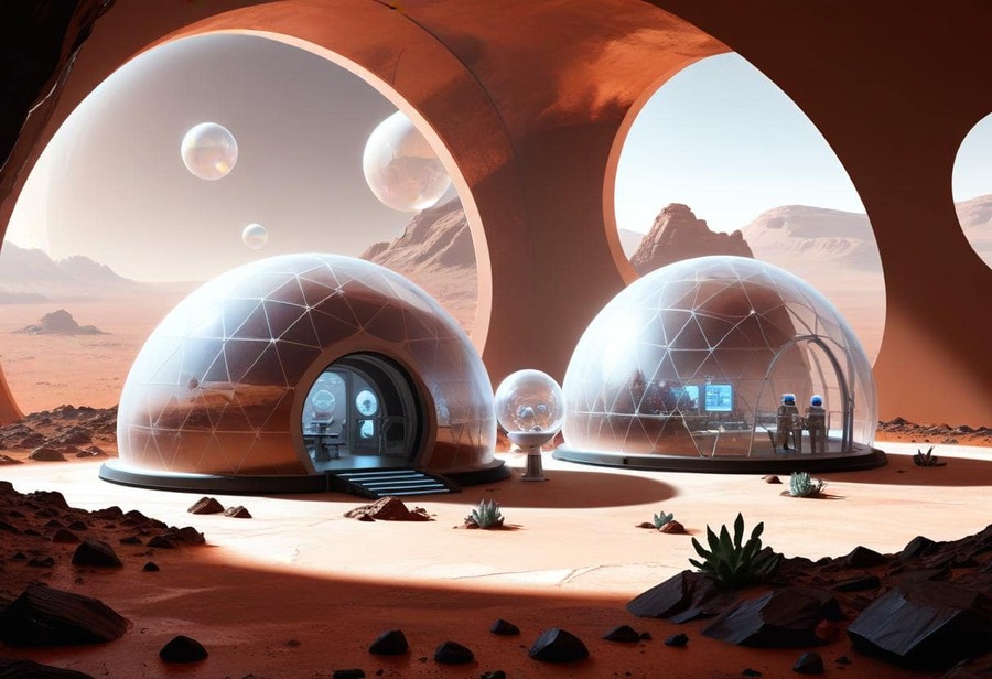 Промпт иллюстрации: Futuristic, cosmic-themed banner featuring a high-tech Mars landscape as the background. In the foreground, a sleek, metallic structure or observatory stands, with smooth curves and glowing accents that reflect the Martian red, orange, and black gradient. A transparent dome nearby showcases several unique, iridescent Martian eggs arranged in a futuristic display. Ambient lighting enhances the cosmic atmosphere, creating a sense of exploration and innovation on Mars. The scene is visually balanced, with high-tech details that evoke a premium, space-inspired aesthetic, ideal for a modern brand.