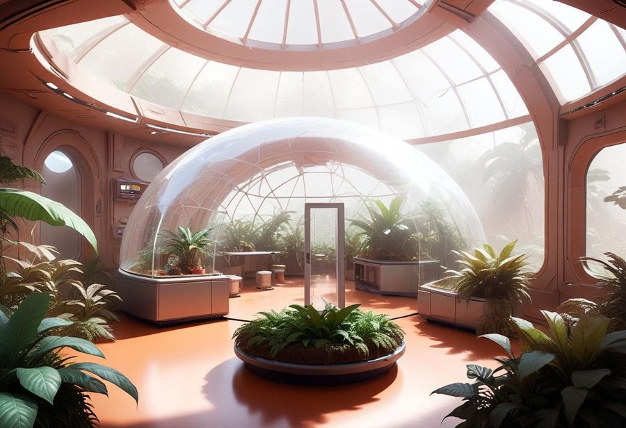 Промпт № 1: Lush tropical zone under a glass dome on a Mars space station, filled with vibrant greenery, warm humid air, and water elements. The dome’s interior is dense with tropical plants, large leaves, and vines, creating a mini-rainforest environment. Eggs are incubated in transparent pods partially submerged in shallow pools of water, surrounded by aquatic plants and mist drifting across the surface. The dome’s structure captures the light, enhancing the warm, natural glow that simulates sunlight in a tropical setting. This humid, vibrant ecosystem with semi-aquatic eggs evokes the energy and lushness of a thriving rainforest.