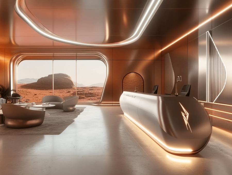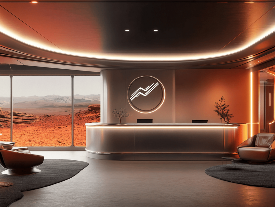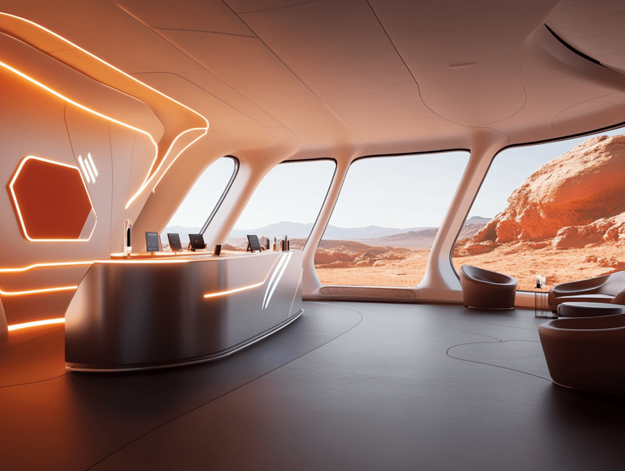Промпт: Reception area on a futuristic space station on Mars, designed with large panoramic windows showcasing the red Martian landscape. Minimalist decor with sleek metallic surfaces and subtle lighting, creating a welcoming and high-tech atmosphere. The reception desk is modern, with a line-based logo subtly illuminated on the wall behind it. The furniture is clean and modern, blending shades of silver, deep gray, and muted red accents to reflect the Martian theme. Background elements evoke a cosmic, premium quality with warm lighting that creates a cozy yet space-inspired ambiance.