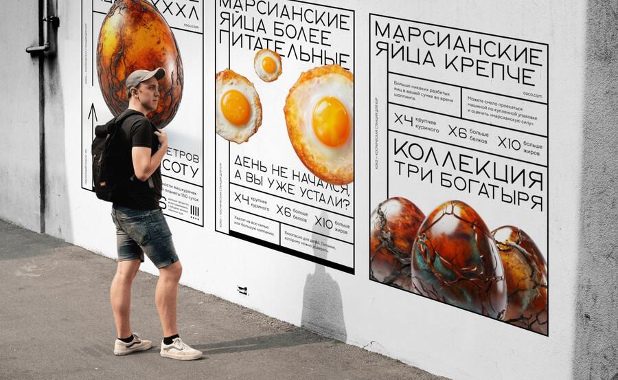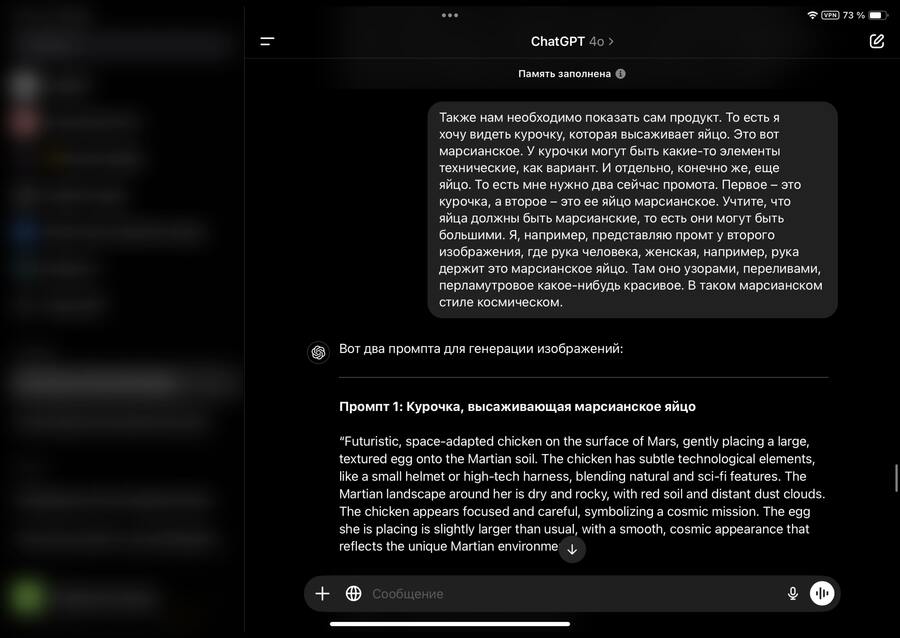 Сначала был создан расширенный промпт с помощью плагина God of Prompt для настройки ключевых параметров работы с чат-ботом. Затем через GPT была сформулирована финальная концепция проекта и определены основные смыслы, которые должны передаваться в каждом изображении. Модель подготовила текстовые описания на английском языке, учитывая все заданные детали — от характеристик среды до особенностей марсианских яиц.