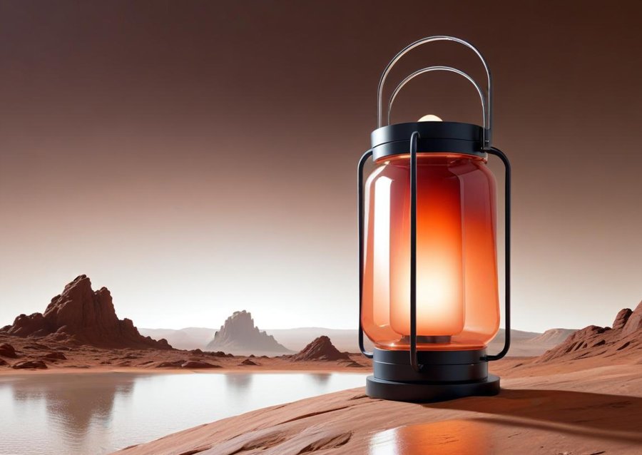 Промпт № 4: Modern, futuristic lantern inspired by a space mission to Mars. The lantern is crafted with metallic and glass materials, incorporating gradients of red, rusty orange, and black, with a subtle glow mimicking the colors of the Martian landscape. The design features smooth, aerodynamic lines and a premium finish, with the brand’s logo subtly engraved on the metal frame. The light casts a soft, warm ambiance, evoking a cosmic atmosphere.