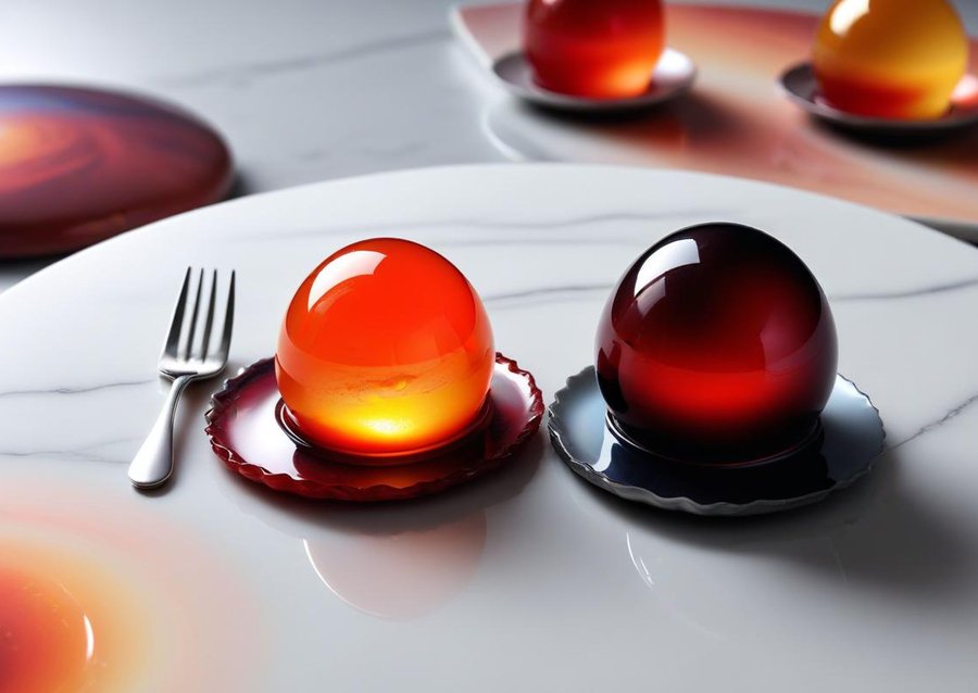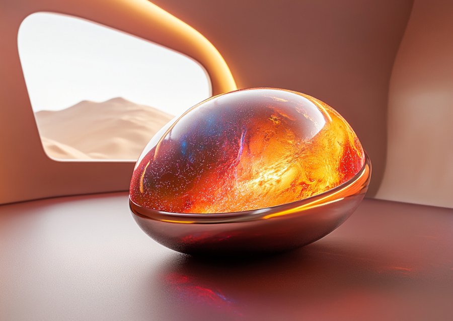 Промпт № 2: Close-up, realistic photograph of a cosmic-themed dessert on a white marble table. The dessert is a glossy, jelly-like pastry with an iridescent finish, shaped like a small planet or Martian egg. The surface displays swirling, vibrant colors in shades of red, orange, and metallic shimmer, creating a cosmic, otherworldly effect. A silver fork rests on the edge of the plate beside the dessert, adding a touch of elegance, and the dessert is served on a minimalist white plate, enhancing its visual impact in the premium, space-inspired setting.