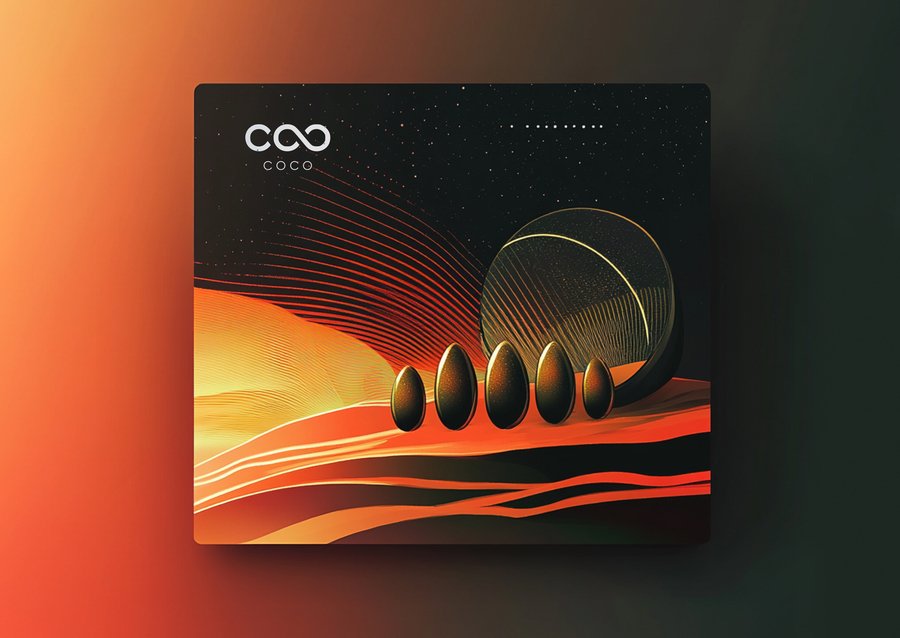 Промпт: Mockup of a large, futuristic banner or poster in a cosmic style, positioned facing the viewer on a white background. The design features a gradient of deep red, rusty orange, and black, inspired by the Martian landscape. A minimalist symbol or pattern represents the brand, with the text ‘Coco’ in a modern, bold font. The banner/plakat is styled with sleek, metallic details and cosmic textures, evoking a premium and space-inspired atmosphere. The layout is clean, modern, and visually striking, ideal for a futuristic brand