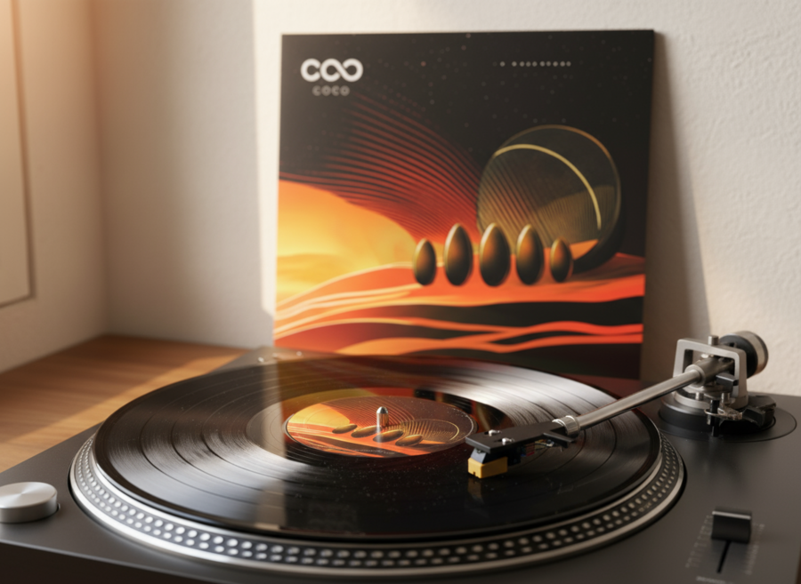 Промпт фото: Realistic photograph of a vinyl record player viewed from a top-side angle, set in a minimalist, futuristic living room with cosmic gray tones. The record player has a sleek, metallic design with shades of deep gray, silver, and subtle accents of red, inspired by a Martian theme. The vinyl record is spinning, displaying a soft, iridescent cosmic pattern. The room is decorated in a minimalistic style with clean lines, smooth surfaces, and ambient lighting, creating a serene, futuristic atmosphere. The interior combines a high-tech aesthetic with cozy, subtle details, embodying a modern, space-inspired living space.