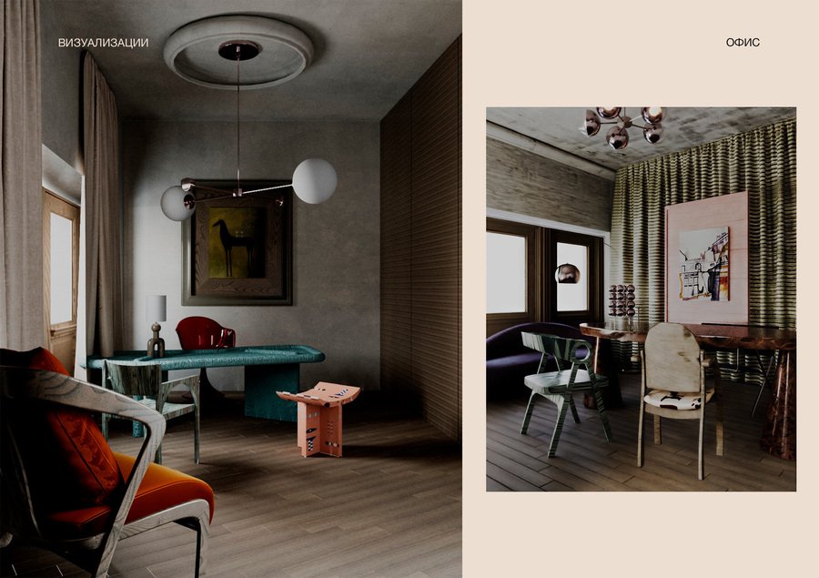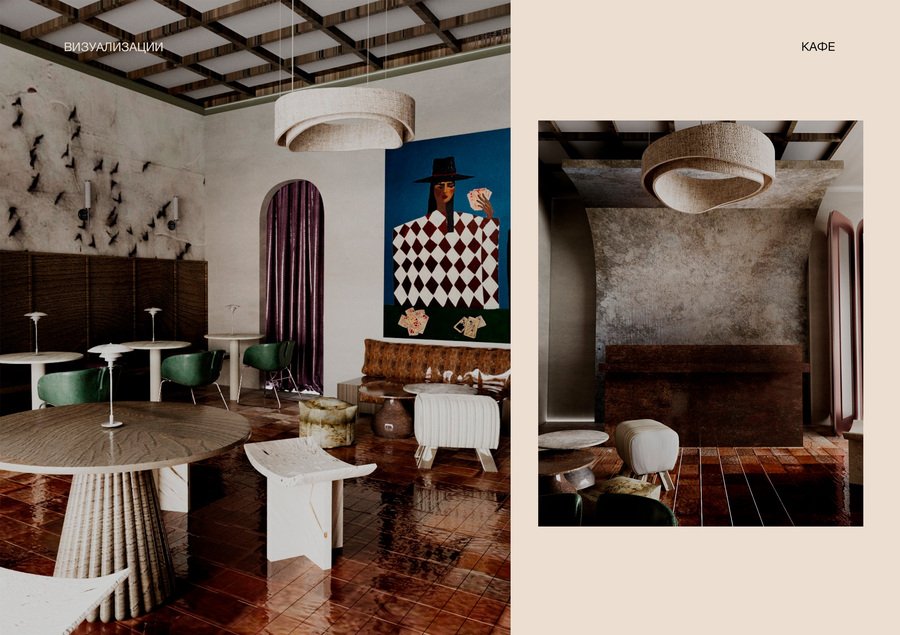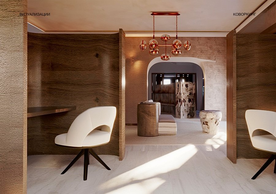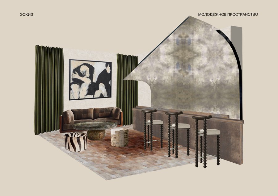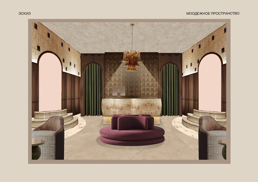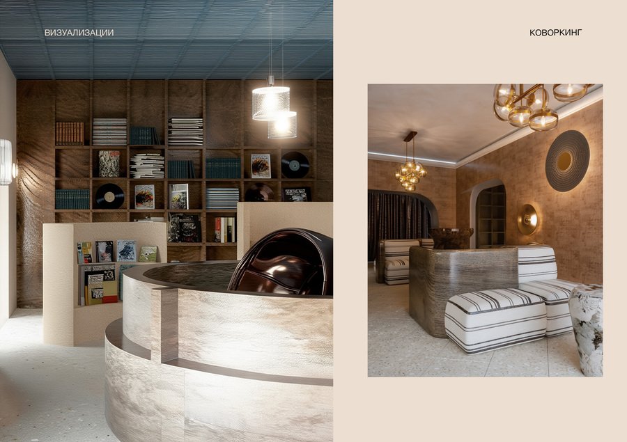 Пространство создаёт ощущение культового места для работы и встреч, где эстетика важна не меньше функциональности. Интерьер основан на сочетании глубоких оттенков, выразительных материалов и тщательно выстроенной световой среды, напоминающей атмосферу частных арт-клубов. Арочные формы, текстильные драпировки, коллекционная мебель и локальные акценты формируют интеллектуальный и утончённый характер пространства.