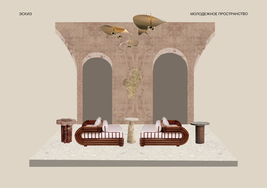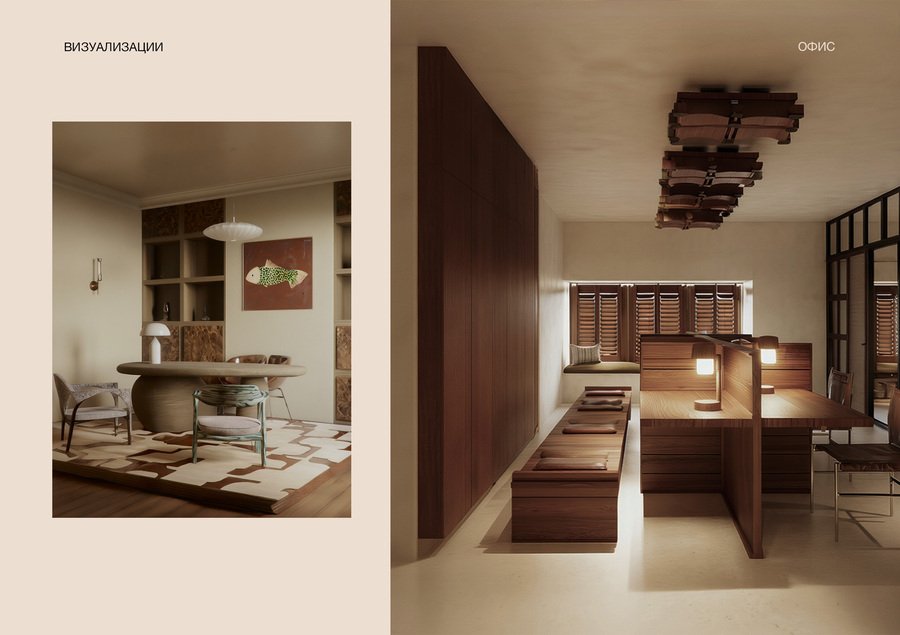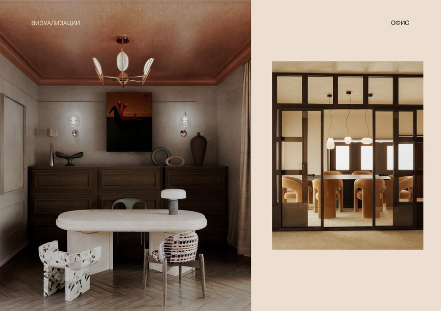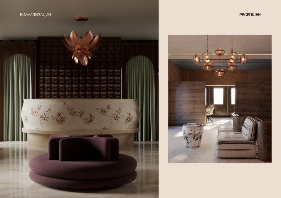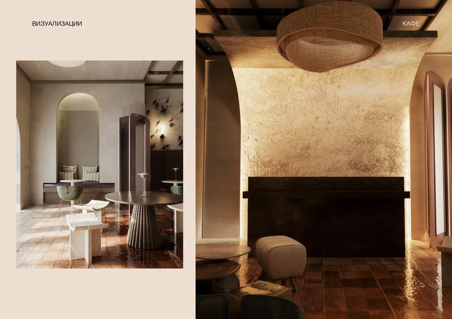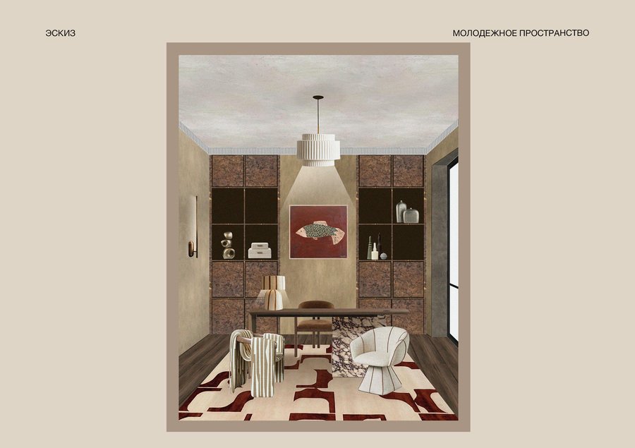 Пространство создаёт ощущение культового места для работы и встреч, где эстетика важна не меньше функциональности. Интерьер основан на сочетании глубоких оттенков, выразительных материалов и тщательно выстроенной световой среды, напоминающей атмосферу частных арт-клубов. Арочные формы, текстильные драпировки, коллекционная мебель и локальные акценты формируют интеллектуальный и утончённый характер пространства.