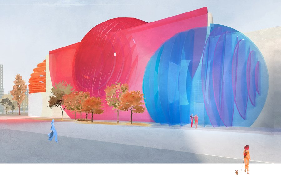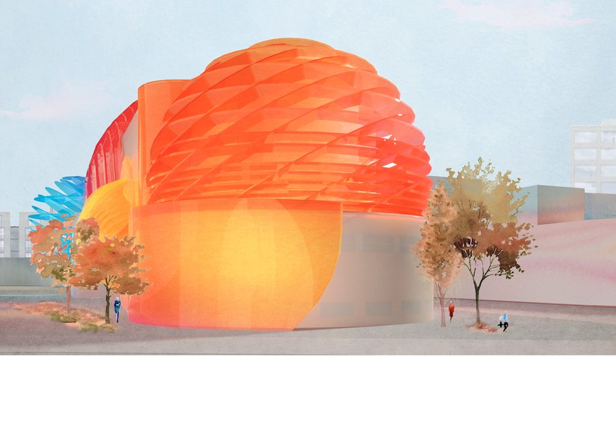 Размышления художника о космосе и обращение к современности и науке в его творчестве отражены в концепции архитектурного фасада в виде отсылки к планетарным формам и световому преломлению солнечных лучей.
