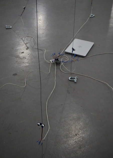К каждому из 7 свисающих тросов прикрепить датчики. От каждого датчика до центра протянуть 1,5 метра витой пары. Пока в поле действия датчика никого нет, звук постоянный. При попадании объекта в зону реагирования, и по мере его приближения к датчику до расстояния <20 см, звук должен утихать до тишины.
