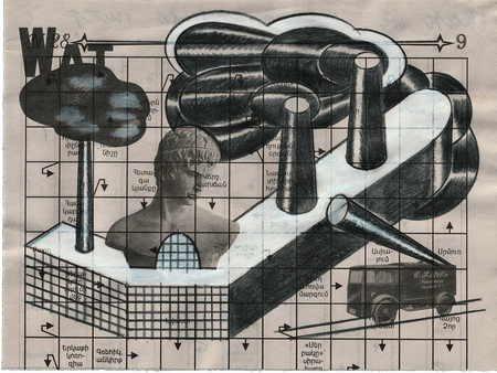 «Перед нами пейзаж, видный из окна второго этажа отеля „Нирвана“, две звезды. Это в Дилижане. Сверху — горы, оммаж великому японскому плакатисту Кацумаса Нагаи из поздних 90-х; внизу деревья с персидской миниатюры XVIII века».