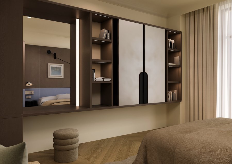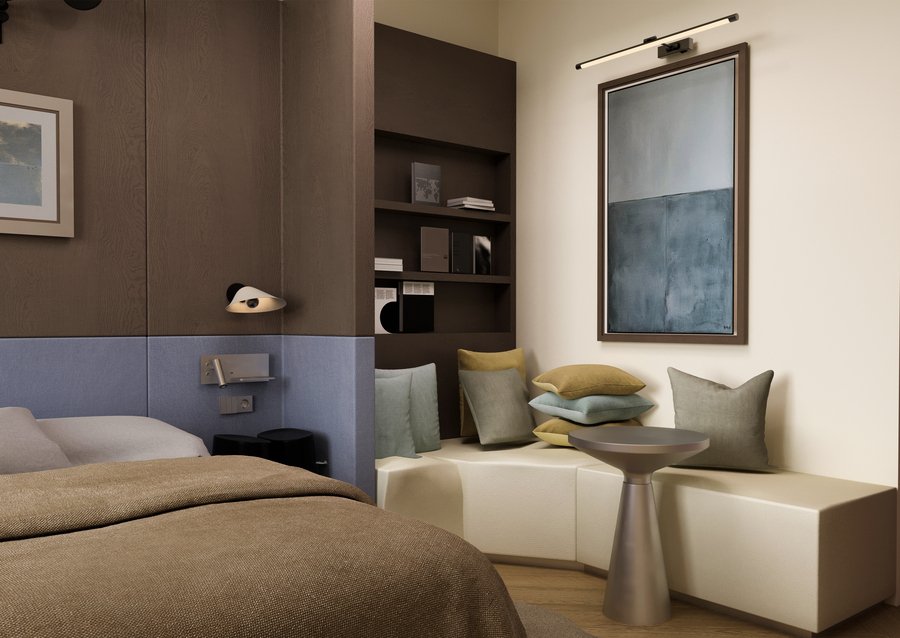 Концепция отеля «Лукоморье» вдохновлена образом тихой бухты, где вода мягко встречается с песком. Интерьер построен на перетекании теплых оттенков дюн и глубоких синих акцентов моря, создавая пространство для внутренней паузы и собранности. Выветренное дерево, патинированный металл и рассеянный «балтийский» свет передают ощущение границы стихий, где мир становится проще, а мысли — яснее.