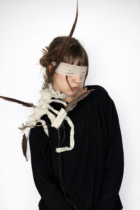 Уникальный арт мерч по трагедии «Орестея» представляет многофункциональный аксессуар, напоминающий строение экзоскелета. Он повторяет анатомию человека, но не копирует её буквально. Линии обвивают голову, шею, плечи, могут продолжаться на предплечье — объект не закреплён в одном месте, он кочует по телу, подстраивается под него.
