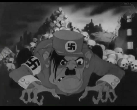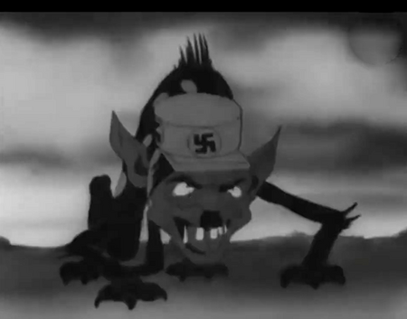 Ещё одно сравнение героя с животным. В патриотическом мультфильме военного времени «Били, бьём и будем бить» враг изображён шакалом, который представляет из себя довольно жалкое зрелище. Здесь не метаморфоза в анимации, однако явное отождествление через недолгий кадр.