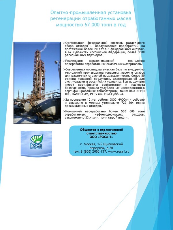 Описание: Создание системы раздельного сбора, накопления и транспортирования к местам утилизации отходов группы «нефтепродукты» в 15 субъектах РФ от Калининградской до Амурской области через обособленные подразделения. Строительство и эксплуатация «Опытно-промышленной установки регенерации отработанных масел» мощностью 67000 тонн в год. Производство широкого ассортимента легированных смазочных масел, пластичных смазок и специализированных жидкостей.