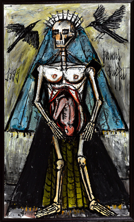 Бернар Бюффе создал много картин со Жнецом, но у многих из них видны похожие мотивы — Смерть, одетая в пышное платье и окруженная птицами, рассматривает наблюдателя. Первоначально эта картина вызывает скорее шок, и это преднамеренно, но некоторые элементы работы выделяют ее, как некомфортного спутника и одновременно надежную константу. В своей позе и одежде, смерть будто бы стремится показаться святой фигурой, а в сочетании с ребенком, она становится похожей на Богоматерь. Это подпитывает мысль о смерти как начале жизни, ставит ее в положение неприятной, но ключевой роли продолжения жизни.