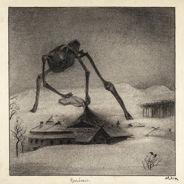 Эта работа Альфреда Кубина еще сильнее выделяет сторону «неохотной работы» Жнеца, показанную в серии Кете Кольвиц, в то же время представляет его в устрашающем виде. Нагибаясь, огромное темное пятно начинает напоминать что-то паукообразное, но в то же время, несмотря на «нехватку» мимики, в самой позе Смерти читается тяжкость ее работы, усталость и неохота. Эта работа также поддерживает мотив жнеца, так часто предписываемый Смерти, создавая образ Смерти-сеятеля: болезнь, которой скелет наполняет дом, — лишь семена будущей, неизбежной жатвы.