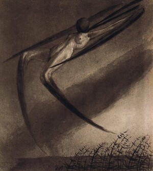 В работе «Каждую ночь нас посещает сон» Альфред Кубин изображает более угрожающее существо. В отличие от змея Кандинского, оно, похоже, более уверено в своей природе. Его фигура напоминает нагую женщину, но голова существа полностью перевязана, а его конечности заканчиваются темными лезвиями, как у химеры, настолько обыденной в хтоническом мире. Это существо витает над полем, и пятно за его спиной будто бы намекает на тень, которую это существо отбрасывает на округу. Будучи ослеплено повязкой, это существо не создает впечатления неловкого движения вслепую. Видя все через повязку, оно будто бы способно на более глубокое понимание мира, которое нам не знакомо, видит то, чего не видим мы.