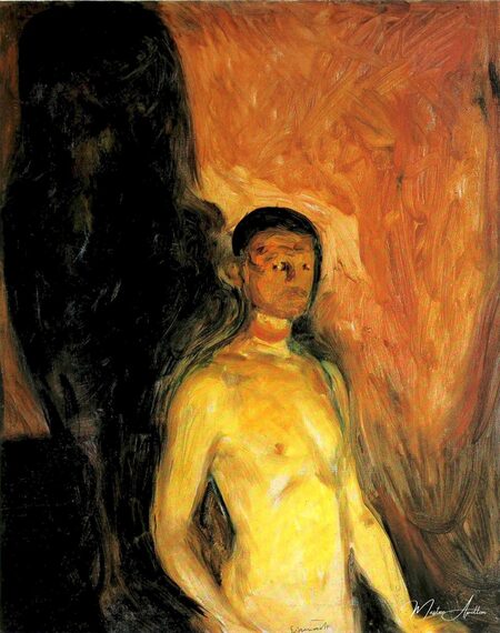 В «Автопортрете в аду» Эдвард Мунк переворачивает обычно спокойный жанр автопортрета — композиция, построенная из горячих оттенков и резких теней, сразу вызывает тревогу и дискомфорт. Лицо героя, будто плавящееся от жара, трудно точно прочитать, но глаза смотрят на зрителя с печалью, чуть ли не сожалением. По сравнению с Альфредом Кубиным, Мунк изобразил подземный мир скорее как пытку индивида, чем человечества в челом. И если автор работы, бог своего творческого мира, находит заслуженным изобразить себя в преисподней, то какой судьбы достоен зритель, нередко внешний художественным работам, или герои его творческого мира, чей мир находится на пальцах их созидателя?