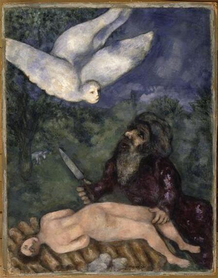 «Авраам приносит своего сына в жертву» Марка Шагала представляет библейский сюжет с участием ангела. Работа исполнена в преимущественно темных, неярких тонах, что позволяет аморфной фигуре ангела еще больше выделяться в ночном пространстве. Сам ангел несет мало человеческих черт, обладая лишь лицом, кажущимся жутким, из-за своей простоты, по сравнению с лицом Авраама или его сына. Снисходя с небес, ангел принимает искаженную, неестественную позу, кажется бесформенным, из-за чего он начинает выглядеть скорее как призрак. Но ангел не показан как антагонист — светлое пятно останавливает Авраама, готового принести своего сына в жертву. Хоть в этой работе ангел и изображен жутко и не вызывает доверия, на первый взгляд, здесь они остаются доверенной силой добра.