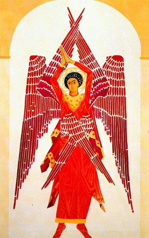 «Шестикрылый серафим» Натальи Гончаровой изображает шестикрылого ангела в минималистичном пространстве. Эта работа несет много соответствий с иконописью: элементы стиля изображения ангела напоминают стиль изображения в русской иконописи, приближая цель изображения к возвышению. Сам ангел показан в молитвенной позе, поднимая руки к небесам, но его тело выглядит расслаблено. Доминирующие цвета в изображении — красный и золотой, значительные цвета в иконах. Золотой цвет многозначен, от изображения пространства, до возвышения святых фигур, красный цвет обычно служит для изображения сил жизни и добра, и нередко использовался в изображении серафимов. Арка, в которой ангел стоит, тоже изображена золотом, возвышая это пространство. Крылья ангела сложены будто для защиты ангела от вреда, но также имеют качества символа. Этот серафим изображен с возвышением, уважением. Он показан, как мирный, сдержанный хранитель святой земли, держащий под контролем свои животные качества, которые Таннинг выделила в «Ангелах хранителях».