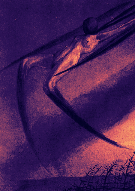 Представленное изображение демонстрирует шокирующую сцену, в которой Смерть посещает обезглавленное тело, в узнаваемом стиле Альфреда Кубина. Здесь Жнец носит белую мантию и «колючую» корону, придающие ему возвышенное, «чистое» впечатление. Женщина не выглядит, как жертва своего преследователя — она была мертва, а Смерть лишь пришла за жатвой, теперь испивая душу из мертвого тела. Мертвая сидит в умиротворенной позе, будто бы принявшая свою судьбу, прежде чем конец настиг ее. Место смерти выглядит недружелюбно, но туннель сзади персонажей мог быть символом пути в лучшее место. Плавный, светлый силуэт Ангела смерти контрастирует с угрожающим пространством и создает впечатление комфорта, однако лишенная дружелюбия ужасающая костяная улыбка которое и устремленный прочь от трупа вдаль пустой взгляд подрывают этот «мирный» образ. Любой мнимый покой, даруемый смертью, — лишь временный обман зрения, не способный скрыть ужасающей правды. Тонкая, еле-заметная душа, которую Смерть пьет из шеи «покойной» — лишь одна из большого списка людей, дом которых посетит потеря, и в такой перспективе, то, что находится на другом конце туннеля, не имеет значения — оно слишком далеко, чтобы предоставить какой-либо комфорт и живым, и мертвым.