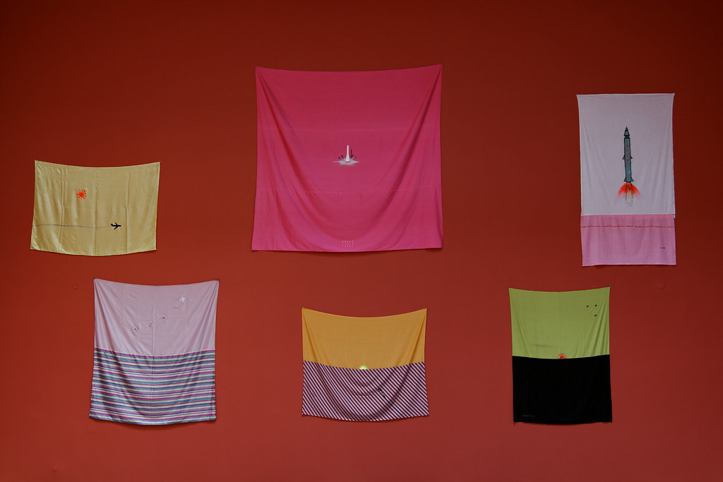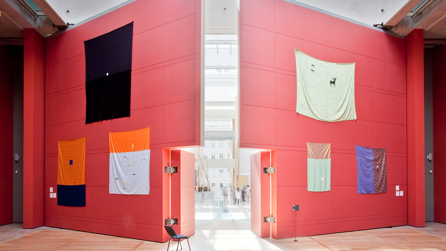 Далее представлены работы Тимура Новикова, еще одной ключевой фигуры русского современного искусства Ленинграда и Петербурга 1980-90-х годов. Его «Горизонты» в виде текстильных коллажей и минималистичных природных пейзажей были размещены в одном из просторных атриумом.