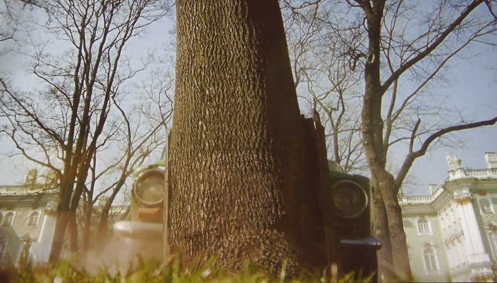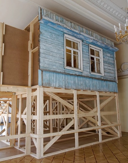 Мы видим наполовину снесенный советский многоквартирный дом, комнаты которого почти одинаковы, однако есть важная отличительная деталь, а точнее оммаж. В каждой комнате висит картина представителей русского революционного конструктивизма, среди которых Малевич, Розанова, Филонов, Родченко и Наумов.
