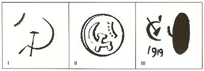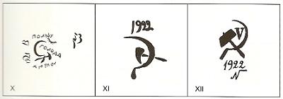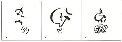 I — Первый советский знак. Фарфор ГФЗ, 1918 — 1936. II — Знак в тесте 1920 — 1930х гг. III — вариант знака I, 1919. IV — вариант знака I, 1919. V — вариант знака I, 1921. VI — вариант знака I, 1921.