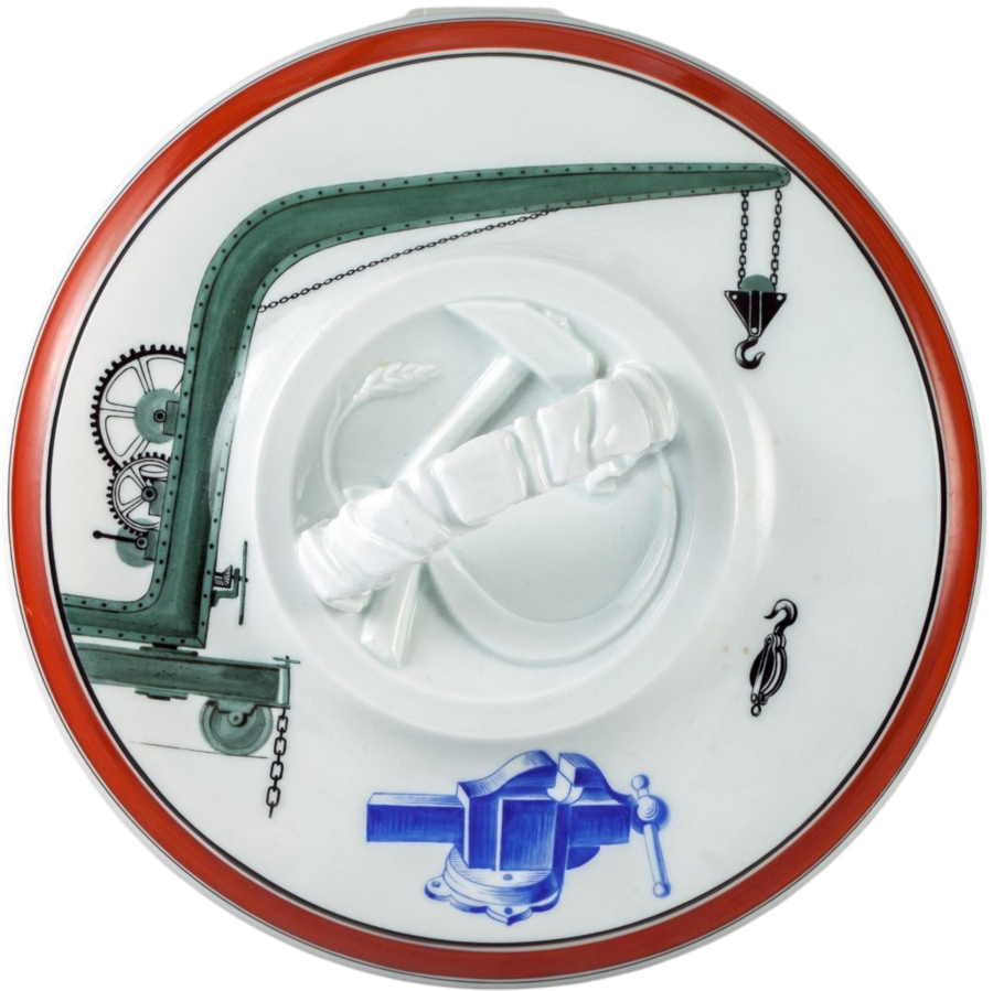 Серп и молот, выполненные с изяществом, часто становились единственными элементами дизайна на тарелках, иногда дополняемыми цветами и листвой или каллиграфически оформленными инициалами РСФСР. Однако со временем мастера завода начали вводить в оформление новые визуальные символы, отражающие идеалы Советской России — земли рабочих и крестьян. К ним относились плуг, борона, коса, грабли, топор, ледоруб, клещи, гвоздодер, пила и стальная пружина. В некоторых случаях использовались также масонские символы, такие как циркуль и треугольник или глобус с книгой.