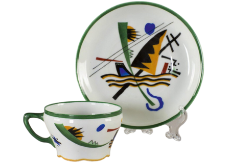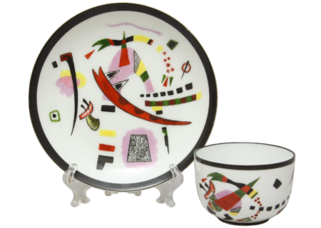 1. Чашка с блюдцем с абстрактными композициями по эскизу Василия Кандинского. Около 1921 г. Дулёво. Музей МОС-ГОС. худ-пром. имени С. Г. Строганова. 2. Чашка с блюдцем. ГФЗ. 1923 г. Государственный музей
