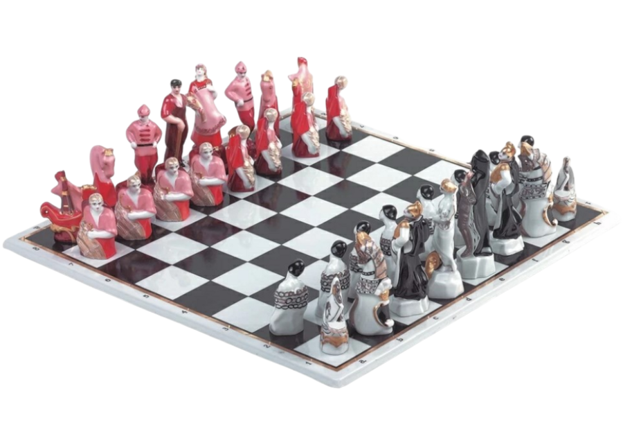 Шахматный набор «Красное и белое». Автор формы: Данько Н. Я. Противопоставление двух миров в пространстве шахматной доски — старой имперской России и новой советской власти — выразительно и наглядно.