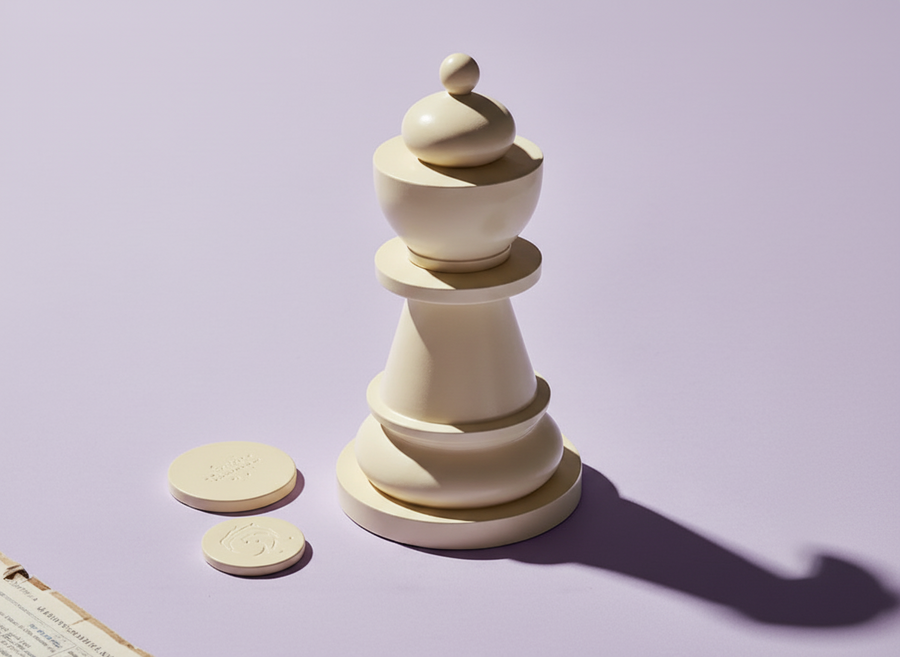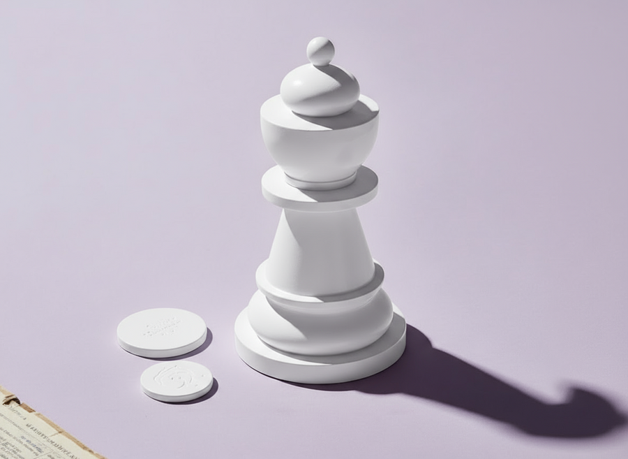 Промпты: 1. Создай изображение шахматной фигуры на белом фоне в стиле минимализм 2. Перекрась фигуру в светло-фиолетовый 3. Сделай круговую обводку. 4 Напиши внизу The Gods War