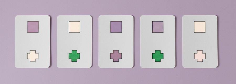 1. Уменьши ширину карточки в 2 раза 2. Сделай фон карточки белым 3. На верхней стороне карточки нарисуй квадрат, а на нижней плюс. 4. Закрась 2 и 4 плюс в зеленый. 5. Закрась 1 и 5 плюс в белый. 6. Закрась 3 плюс в белый. 7. Закрась 1, 3,4 квадрат в светло-фиолетовый. 8. Закрась 2 и 5 квадрат в белый.