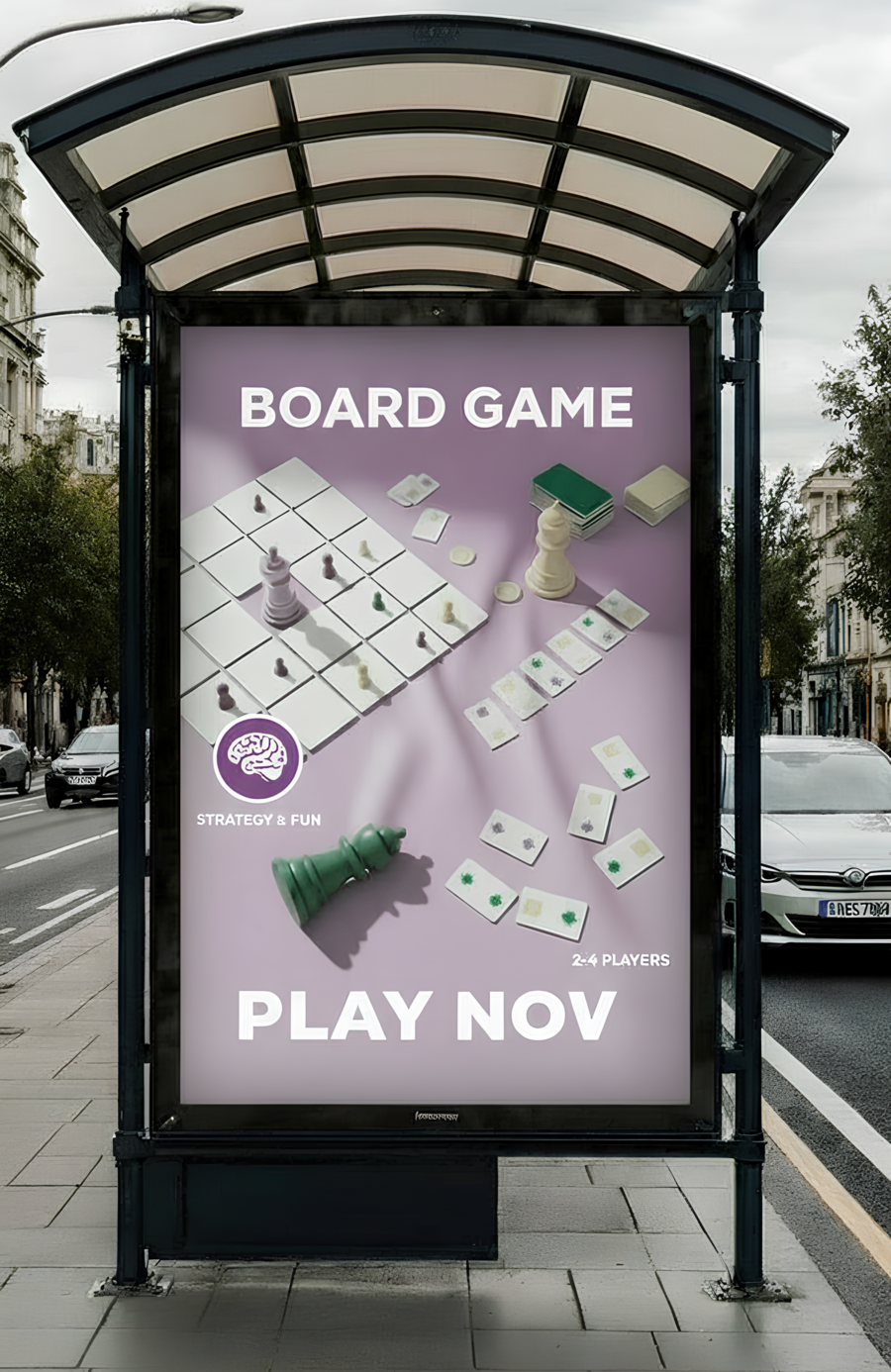 На фото изображен процесс создания настольной игры. Промпты: 1.Сгенерируй процесс производства настольных игр, используй светло фиолетовые тона. Это должно быть производственное помещение, в котором несколько людей собирают колоды карт и фишки в коробки. Изображение должно быть таким как будто оно сделано в реальной жизни 2.Поместить компоненты на фото 2 в фото 1 (фото 2 это раскладка поля, фото 1 это сгенерированная в 1 пункте картинка)