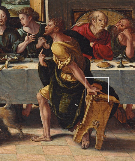 С такой композиционной «подсказкой» сложно не определить Иуду и будущего предателя за столом. Однако другие авторы подходили к расстановке персонажей на картине более скрытным образом. Например, в работе Дирка Боутса не так очевидно, на первый взгляд, где находится Иуда, но как только мы замечаем двух учеников, сидящих спиной к нам, мы понимаем, что выбор нужно сделать между ними. А далее, с пониманием, кто есть кто, нам помогает цвет. Но об этом позже.