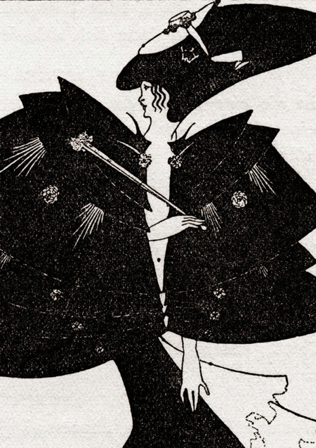 В иллюстрациих Обри Бердсли внимание сосредоточено на линии и форме: скользящие волосы, плоские темные ткани и светлая кожа создают читаемый силуэт, а украшения и орнаменты заменяют повествовательный контекст.