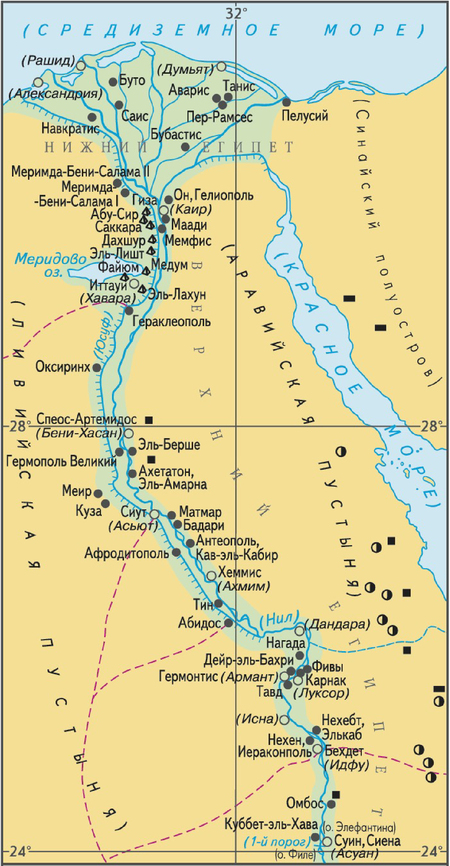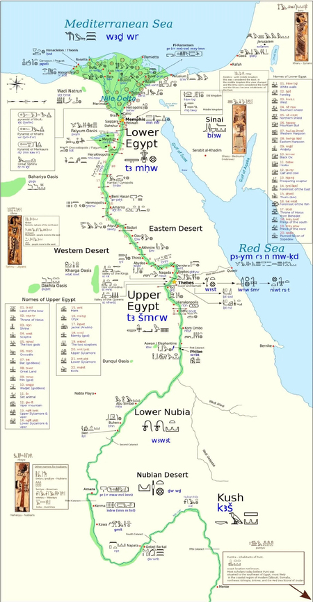Карта Древнего Египта из «Большой российской энциклопедии» и Древняя карта Египта с названиями городов и номов, написанными иероглифами от Джеффа Даля