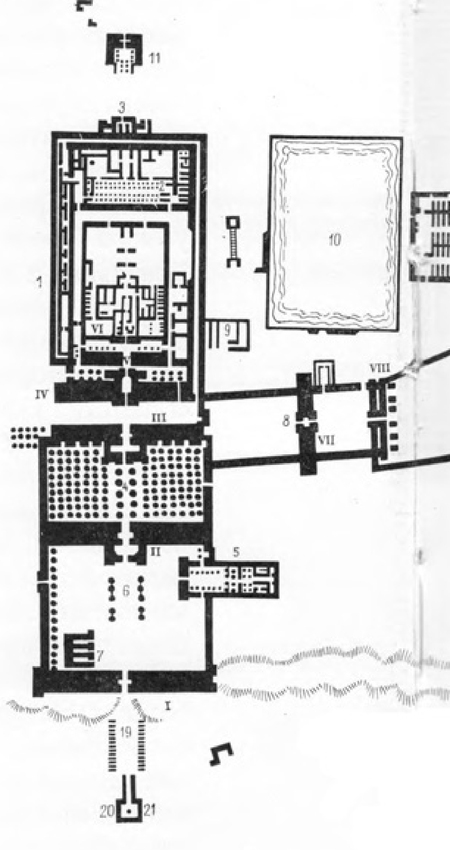 Священное озеро из Карнакском храмовом комплексе и схема Карнакского храмового комплекса