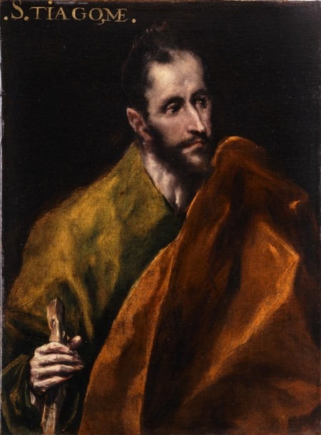 Иаков Зеведеев чаще всего изображается мужчиной средних лет, с бородой и посохом пилигрима в руках.