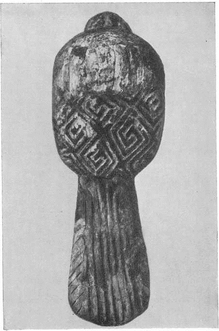 Глядя на фигурку птицы можно заметить зигзагообразный меандр. Вероятно, его роль не сводилась к условному изображению оперения. Скорее всего, этот орнамент наделял образ птицы более широким, символическим значением, связывая его с небесной стихией — небом и облаками. Данное предположение находит подтверждение в этнографии, где меандровый узор традиционно ассоциируется с представлениями о воде, подземном мире, а также о небе и облаках.