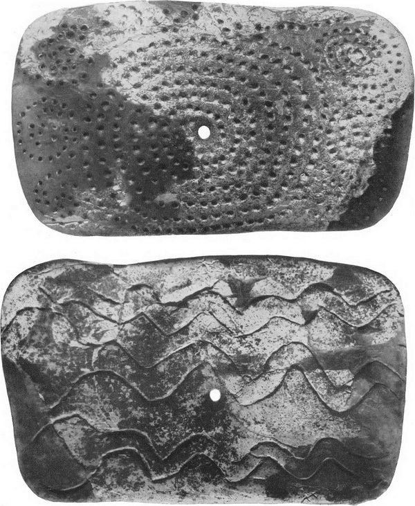 Фигурка птицы из стоянки Мезино. Бивень мамонта. Поздний палеолит. / Бляха, орнаментированная из бивня мамонта. Мальта. Поздний палеолит.