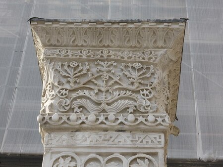 Древнегреческая коринфская капитель из толоса в Эпидавре, около 350 г. до н. э. / Византийские аканты на карнизе в верхней части Пиластри Акритани, 524-527 гг.