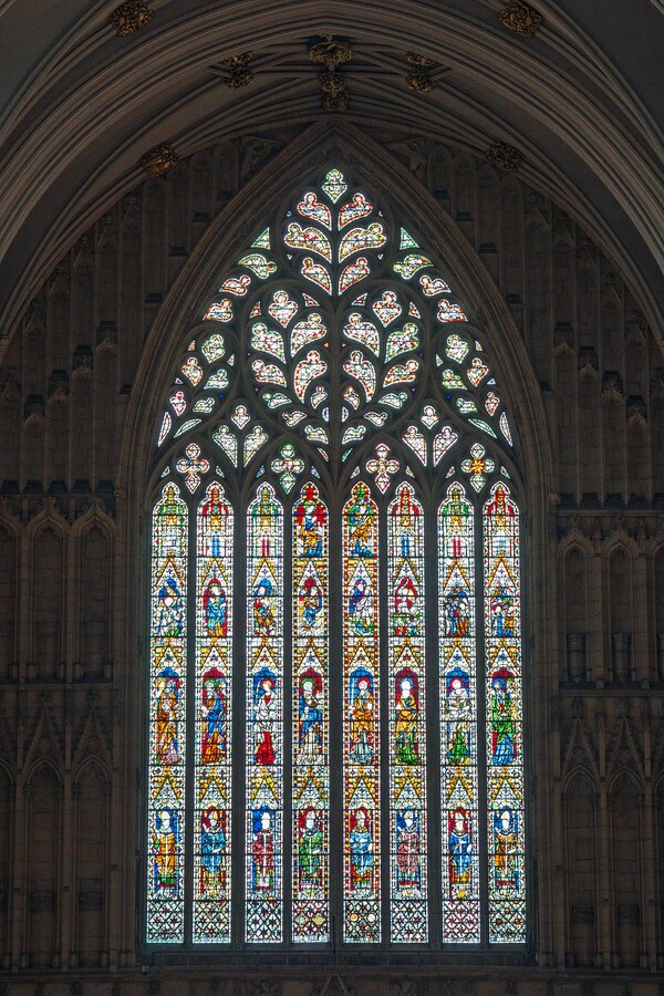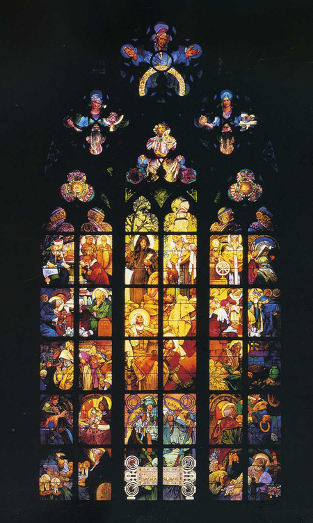 Витраж Альфонса Мухи, расположенный в северном нефе собора Святого Вита в Праге, 1931 г. / Западное окно Йоркского собора, Северный Йоркшир, Англия.