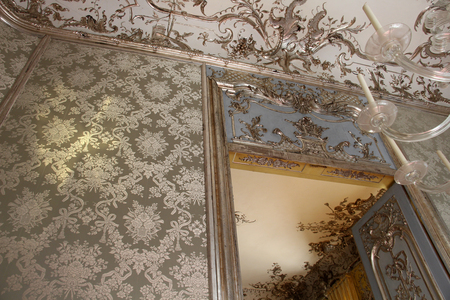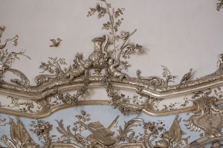 Формально пространство Амалиенбурга построено на рокайле — асимметричных завитках, похожих на раковины и водные струи. Линии текут, изгибаются, дробятся на мелкие детали, так интерьер кажется «живым». Цветовая гамма — серебристо-голубая, пастельная, именно она создаёт ощущение лёгкости. В отличие от версальской тяжёлой позолоты, здесь активно используется серебрение, подчеркивающее хрупкость форм, а позолота служит лишь акцентом. Семантически орнамент обращён к природе, досугу, охоте и игривой чувственности. Вместо аллегорий власти — птицы, цветы, лёгкие ветви, декоративные композиции, связанные с развлечениями придворной жизни. Культурно-исторически Амалиенбург отражает новый образ человека эпохи Просвещения: значимыми становятся личные эмоции, изящество, интимность. Орнамент создаёт атмосферу комфорта и эстетического наслаждения, доступного только элите.