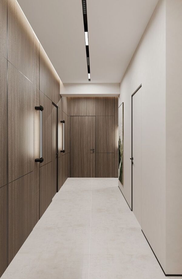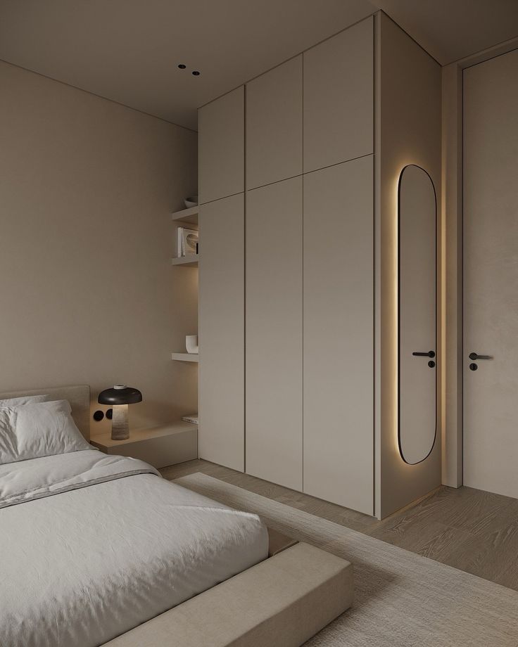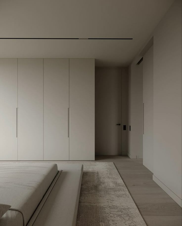 Мебель растворяется в стене, а стена становится элементом общей композиции, где приоритет отдаётся сдержанности, а не насыщенности. Пространство обретает черты абстракции: исчезает визуальная нарративность, и человек уже не «прочитывает» своё жилище через совокупность вещей.
